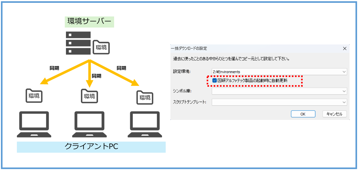 環境を一元管理する場合、サーバー上の環境を直接参照するため、ネットワーク環境が製品のレスポンスに影響を及ぼす可能性があります。