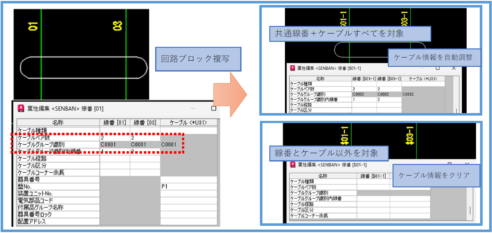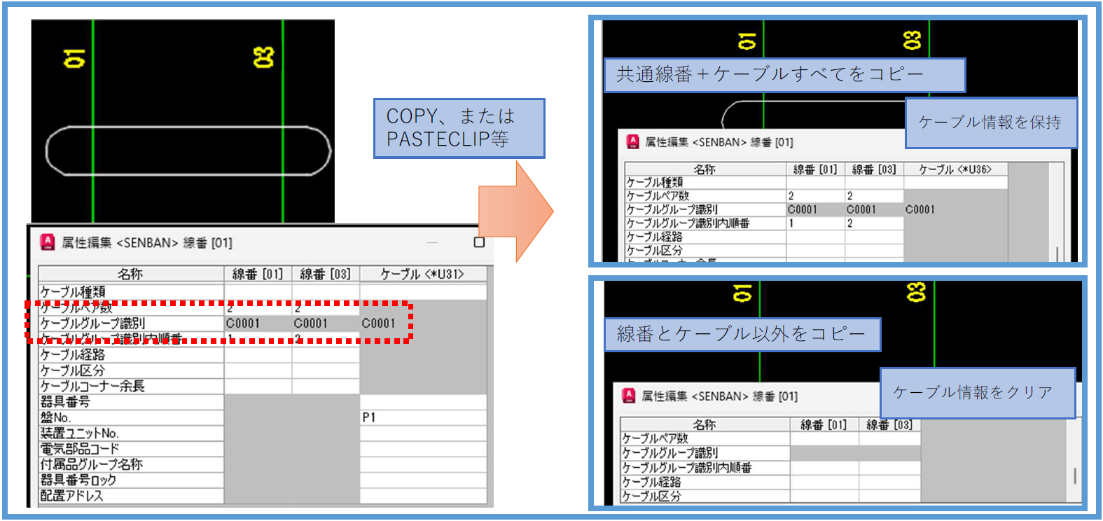 図面に配置された線番シンボルコピー時にケーブルグループ識別の値を自動修正するよう改善しました。