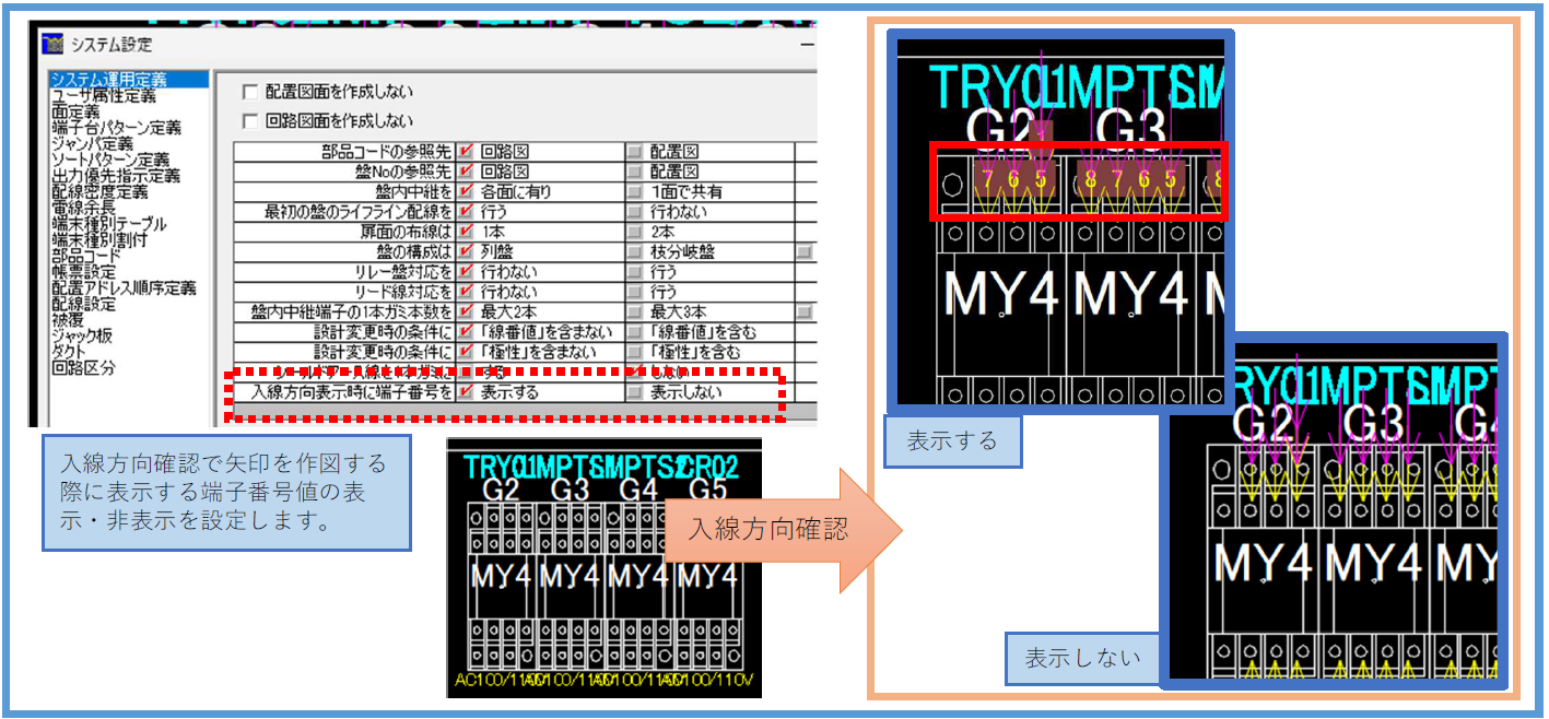 システム運用定義に「入線方向表示時に端子番号を」表示する/表示しないの設定を追加しました。