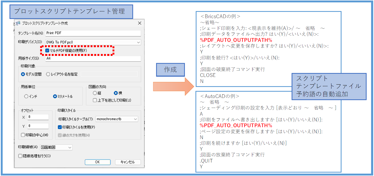 プロットスクリプトテンプレート作成時に「マルチPDF機能の使用」を選択できるようになり、連続印刷におけるマルチPDF作成用スクリプトの作成が容易になりました。