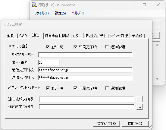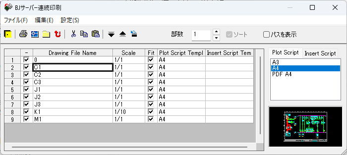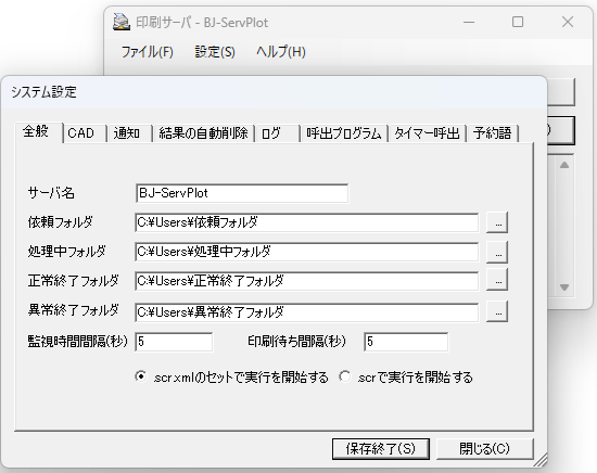 クライアントから印刷対象の図面パスを指定し、用紙サイズ/向き/出力先 等を設定した印刷スクリプトをサーバーの[依頼フォルダ]へ送信します。